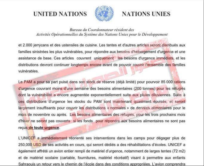 ما زالت تتساقط الأوراق تباعا كاشفة عن "الغول" الذي يبتلع ملايين الدولارات الممنوحة من طرف المنظمات الأجنبية، و التي تظل طريقها بين حسابات عبد العزيز المراكشي و الجنرالات الجزائريين الداعمين له، في حين كان يجب أن تصل إلى ساكنة تندوف، لإنقاذهم من براثن البؤس الذي يتخبطهم، و خير دليل على ذالك حالتهم المزرية بعد الفيضانات التي ضربت المنطقة نهاية الشهر الماضي.