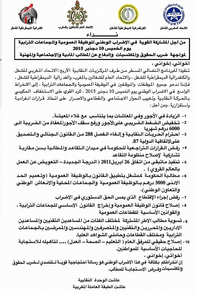 في إطار برنامجها النضالي المسطر ردا على تجاهل بنكيران واستخفاف حكومته بالحركة النقابية على العموم، وإصراره على إتخاذ قرارات وصفتها النقابات بالإستفزازية والإنفرادية في إشارة واضحة لمخططه الذي يسميه "إصلاحيا" لمنظومة التقاعد والذي ترفضه الهيئات النقابية وعموم الموظفين، دعت كل من الإتحاد المغربي للشغل، الكنفدرالية الديموقراطية للشغل، الإتحاد العام للشغالين بالمغرب والفدرالية الديموقراطية للشغل عموم العاملين بالإدارات العمومية والجماعات الترابية لخوض إضراب وطني الخميس العاشر من دجنبر الجاري.
