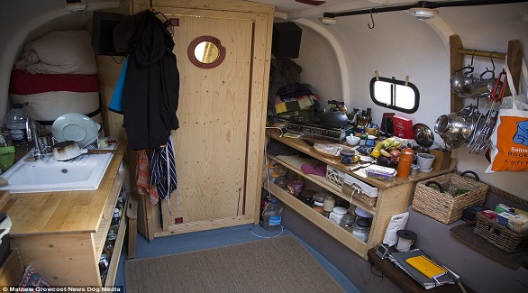 أنفق سايمون وايت (36 عاماً) مبلغ 16000 جنيه استرليني على صنع منزله الجديد الذي بناه على قارب صغير وأمضى حوالي ستة أشهر في بنائه.