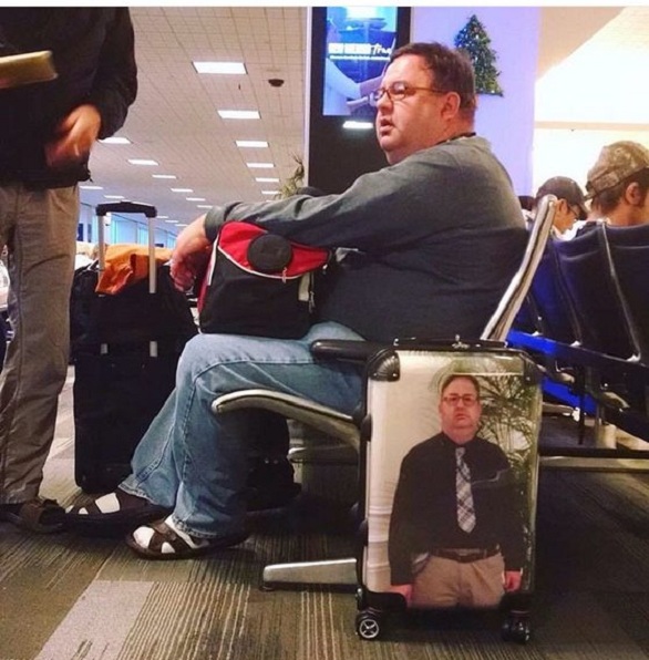 وتظهر الصورة التي نشرها أحد مستخدمي موقع إنستغرام للتواصل الاجتماعي مسافراً يجلس على مقاعد الانتظار في أحد المطارات، وإلى جانبه حقيبة سفر عليها صورته الشخصية التي التقطت على ما يبدو قبل سنوات، حيث يبدو فيها أقل وزناً مما هو عليه في الوقت الحاضر.