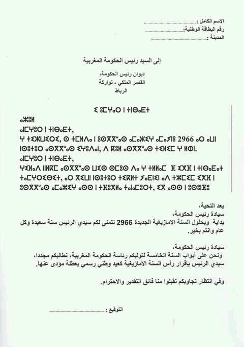 سيادة رئيس الحكومة، ونحن على أبواب السنة الخامسة، لتوليكم رئاسة الحكومة المغربية، نطالبكم مجددا، سيدي الرئيس بإقرار رأس السنة الأمازيغية، كعيد وطني رسمي بعطلة مؤدى عنها".