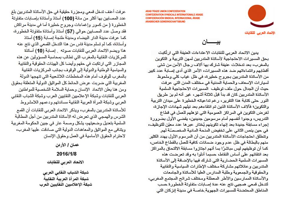 الإتحاد العربي للنقابات، وشبكاته الموازية: شبكة الشباب النقابي العربي، شبكة النقابيين الإعلاميين العرب وشبكة المرأة النقابية العربية والكائن مقرها بعمان الأردنية، أصدرت الجمعة الماضية أي يوما واحدا عن الحادث بيانا أدانت من خلاله ما وصفته بـ"الاعتداء ات العنيفة التي ارتُكبت بحق المسيرات الاحتجاجية لأساتذة متدربين لمهن التربية و التكوين بالمغرب، بعد تدخلات عنيفة شارك بها آلاف رجال الأمن من شتى أقطابهم وانتماء اتهم ضد هذه المسيرات، الأمر الذي أدى ـ حسب البيان دائما ـ إلى إصابة عدد كبير من الأساتذة المتدربين بجروح خطيرة، في ظل غياب كلي وملحوظ لسيارات الإسعاف والحماية المدنية في مختلف المدن التي عرفت المسيرات الاحتجاجية السلمية..."