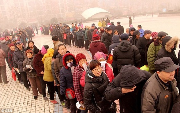ونقلت الدايلي ميل عن صحيفة الشعب الصينية أن السكان المحليين في مدينة ياوتشينغ بمقاطعة شاندونغ شرقي الصين، انتظروا لأكثر من 3 ثلاث ساعات في الطوابير، رغم أن درجة الحرارة وصلت إلى حوالي 5 درجات مئوية، بالإضافة إلى مستويات التلوث المرتفعة في الهواء.