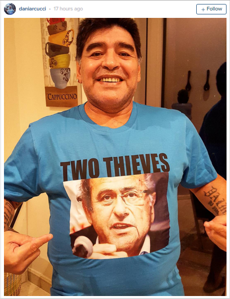 ونقلت صحيفة " فرانس فوتبول " الشهيرة صورة للصحفي الأرجنتيني دانيال أركوتشي من على حسابه على موقع التواصل الاجتماعي " انستجرام" ،و هو يصور مارادونا وهو يرتدي قميص عليه صورة بلاتيني وبلاتر، ومكتوب عليه " اللصان".