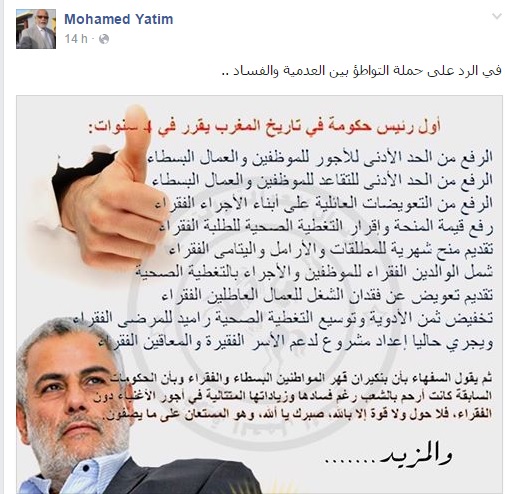 و اعتبر يتيم أن حكومة بنكيران حققت انجازات لم تقدمها أية حكومة سابقة على تحقيقها، فيما يخص الرفع من الحد الأدنى للأجور، وإصلاح نظام التقاعد، ودعم الأرامل واليتامى.