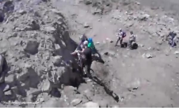 ويظهر السياح الذين يقودهم المرشد جوليان إنسراديل في رحلة تستمر لمدة 3 أيام، وهم يحاولون العبور فوق شق أرضي صغير، كانت الصخور والحجارة تنجرف بداخله بشكل هادىء.