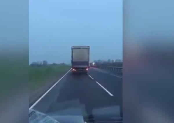التقطت كاميرا مثبتة على الزجاج الأمامي لإحدى السيارات، لحظة إجبار الرياح لشاحنة كبيرة على السير على عجلتين اثنتين على طريق سريعة بالقرب من مدينة دورهام البريطانية.