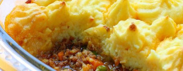ادهني صينية مناسبة بالزبدة ثم وزعي اللحم و وزعي فوقه الجزر، وزعي البطاطس المهروسة بواسطة قمع التزيين فوق الخليط وأخيرا غطي الوجه بالجبن الشيدر المتبقي.