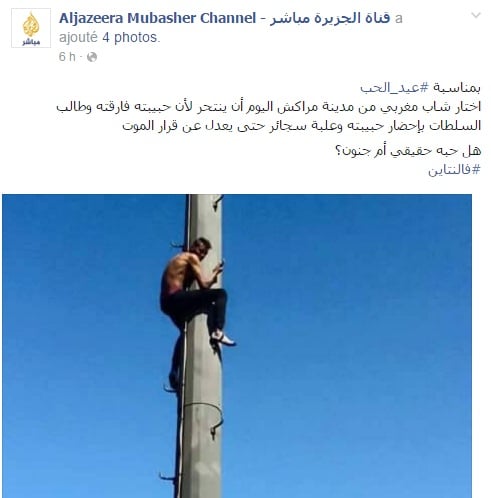 و نشرت الصفحة الرسمية للزميلة الإعلامية "الجزيرة" خبر الشاب المذكور، حيث كتبت : اختار شاب مغربي من مدينة مراكش اليوم أن ينتحر لأن حبيبته فارقته وطالب السلطات بإحضار حبيبته وعلبة سجائر حتى يعدل عن قرار الموت ... هل حبه حقيقي أم جنون؟