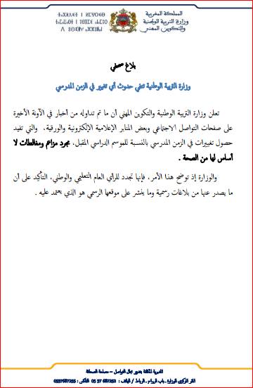 وأضاف بلاغ الوزارة أنها "تجدد للرأي العام التعليمي والوطني، التأكيد على أن ما يصدر عنها من بلاغات رسمية وما ينشر على موقعها الرسمي هو الذي يعتمد عليه ."