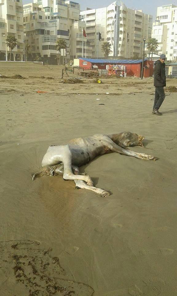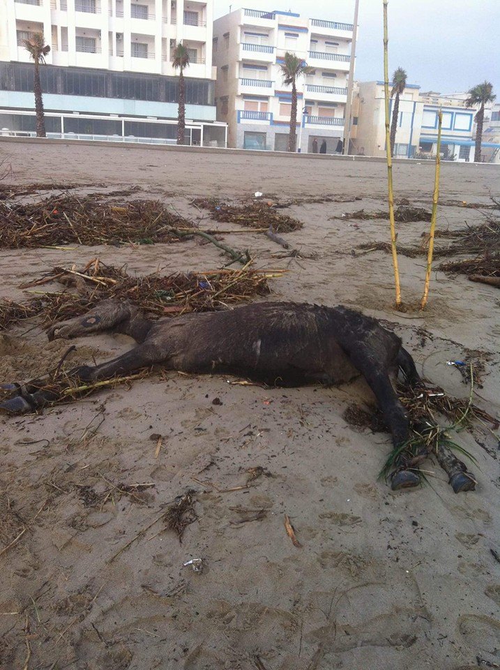 بعد الأمطار الطوفانية .. البحر يلفظ جثتي حصانين بشاطئ مارتيل (صور)