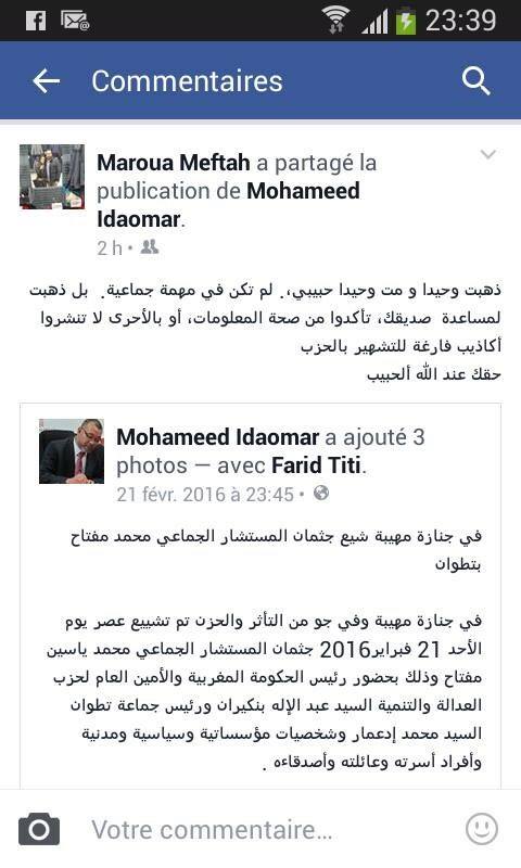 ابنة المرحوم وجهت كلامها من خلال تدوينتها، لرئيس حضرية تطوان محمد ادعمار المنتمي لحزب العدالة والتنمية، الذي ادعى في تدوينة سابقة له قبل أن يحذفها، أن المرحوم كان رفقة لجنة لليقظة تم إنشاؤها من أجل مساعدة الساكنة على إثر الفيضانات التي تعرضت لها المدينة.