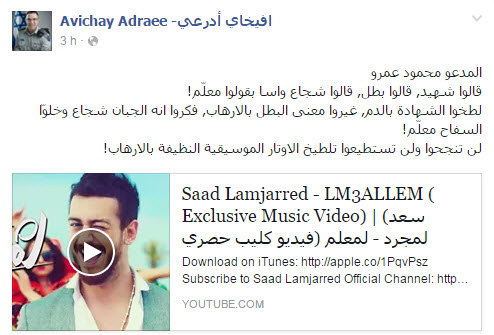 وكتب أدرعي "قالوا عنه شهيد.. وقالوا بطل.. وقالوا شجاع ولسا بقولوا معلم!" موجها كلامه لمتابعيه على الفيسبوك..لن تنجحوا ولن تستطيعوا تلطيخ الأوتار الموسيقية النظيفة بالإرهاب!.".