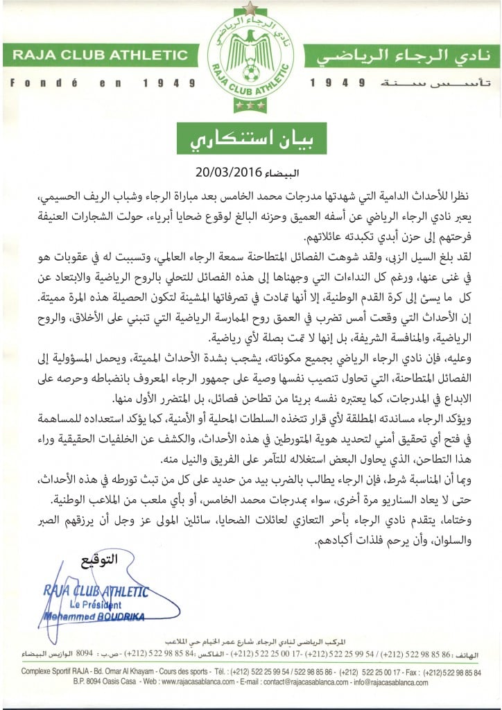 و اعتبر البـلاغ الموقع من طرف رئيس الرجاء محمد بودريقة ، أن الفصائل المتطاحنة شوهت صورة الرجاء و تسبب له في عقوبات هو في غنى عنها ، رغم النداءات الموجهة لهذه الفصائل من أجل التحلي بالروح الرياضية.
