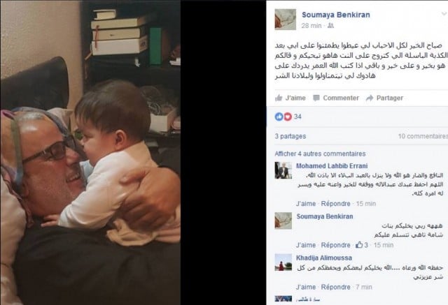 و نشرت سمية على صفحتها بالفايسبوك صورة لوالدها وابنتها شامة، و كتبت تعليقا قالت فيه "صباح الخير لكل الأحباب اللي عيطو يطمئنو على أبي بعد الكذبة الباسلة اللي كتروج على النت ها هو تيحييكم وقال ليكم هو بيخير وعلى خير وباقي إذا كتب الله العمر يدردك على هادوك اللي تيتمناو لو ولبلادنا الشر".