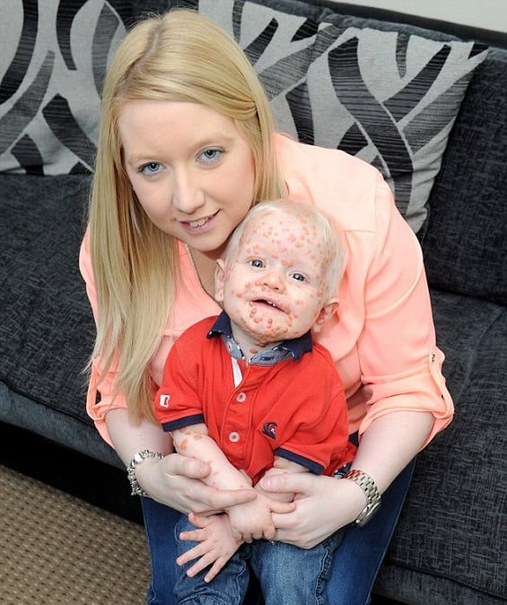 تعرضت بريطانية في الشهور الأولى من حملها لصدمة نفسية قوية بسبب وفاة والدتها وأحد أقربائها، وعلى الرغم من أن حملها سار بشكل طبيعي، إلا أن جنينها تأثر سلباً وأنجبت طفلاً يعاني من مرض نادر جعل وجهه مخيفاً ينفر منه كل من يراه، بسبب البقع الحمراء التي تملأ وجهه وجسمه، يخشون لمسه، اعتقاداً منهم بأن مريض بـ"الجدري" المعدي.