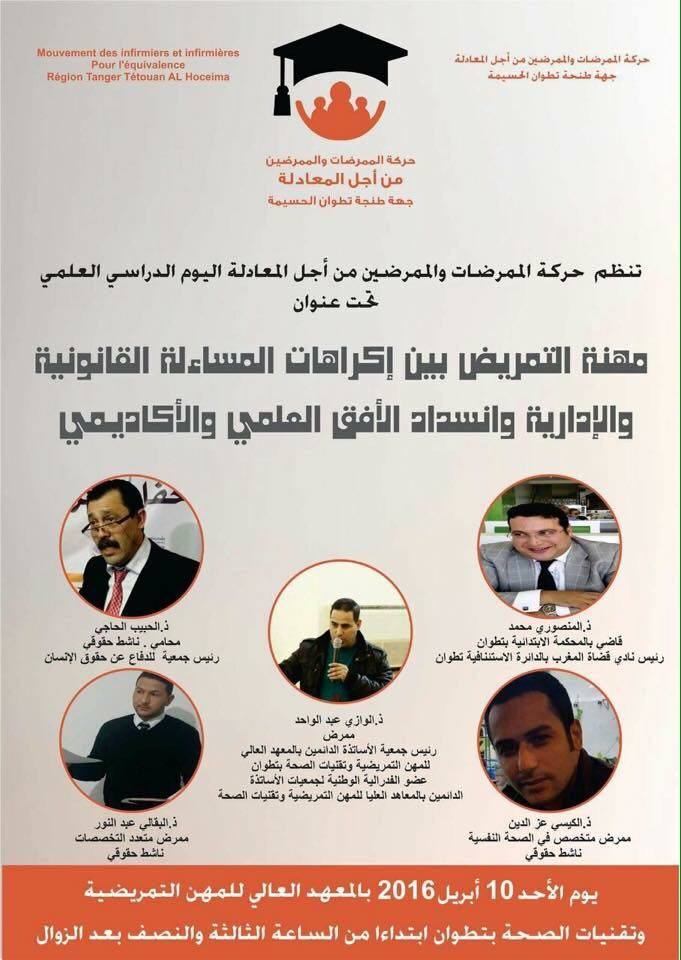 ودعى البقالي عبد النور كافة الممرضين والممرضات وشبكات المجتمع المدني والهيئات الحقوقية والمنتخبون وكل المهتمين بالشأن الصحي لحضور أشغال هذا اليوم الدراسي الذي سيكون مؤطرا من طرف خيرة الأطر التمريضة وكذا المحامي والحقوقي الحبيب الحاجي رئيس جمعية الدفاع عن حقوق الإنسان و القاضي الأستاذ المنصوري محمد رئيس نادي قضاة المغرب بالدائرة الإستئنافية تطوان. اليوم الدراسي سينظم يوم الأحد 10 أبريل 2016 بالمعهد العالي للمهن التمريضية وتقنيات الصحة بتطوان على الساعة الثالثة والنصف بعد الزوال .