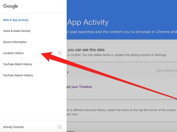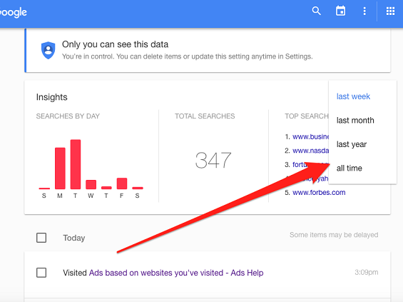 ليس من السهل الوصول إلى صفحة "أنشطة الويب والتطبيقات، فينبغي الدخول إلى حساب غوغل ثم الدخول إلى الرابط https://history.google.com/history/ ثم النقر على "كل الأوقات".
