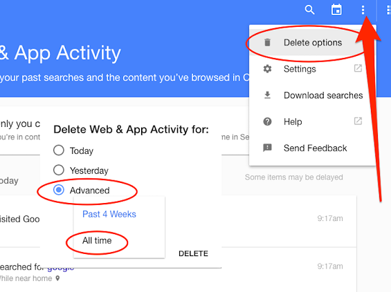 وللرغبة في حذف كافة البيانات المسجلة داخل صفحة "أنشطة الويب والتطبيقات" الخاصة بك، ارجع إلى الصفحة الرئيسية، ثم انقر على الرمز ذات الثلاث نقاط في أعلى الصفحة، ثم انقر على "حذف الخيارات"، ثم "متقدمة" ثم "كل الأوقات".
