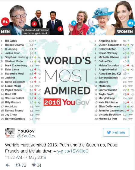 وتقوم منظمة YouGov بتشكيل قائمتين منفصلتين، واحدة للنساء وأخرى للرجال الأكثر احتراما في العالم.