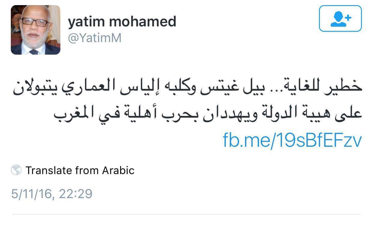 يتيم و إن صح فعلا هذا الحساب المنسوب إليه عبر " التويتر " ، كتب : " خطير للغاية … بيل غتيس و كلبه إلياس العماري يتبولان على هيبة الدولة ، و يهددان بحرب أهلية في المغرب " … عبارة تحمل قذفا معلنا و اتهامات خطيرة جدا ، قد تخلق حالة من الفوضى داخل البلاد ، كيف لا و قد صدرت عن مسؤول يعد نائبا برلمانيا و مسؤولا نقابيا ، يعد من بين أبرو كوادر الحزب الحاكم .