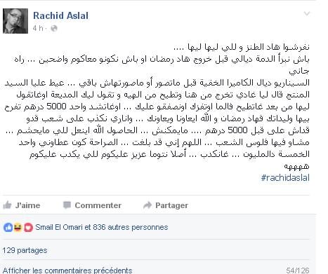 تداول نشطاء موقع التواصل الاجتماعي (الفايسبوك) تدوينة نشرها الفنان الفكاهي الامازيغي ” رشيد اسلال “ يفضح خلالها فبركة الكاميرا الخفية في شهر رمضان.