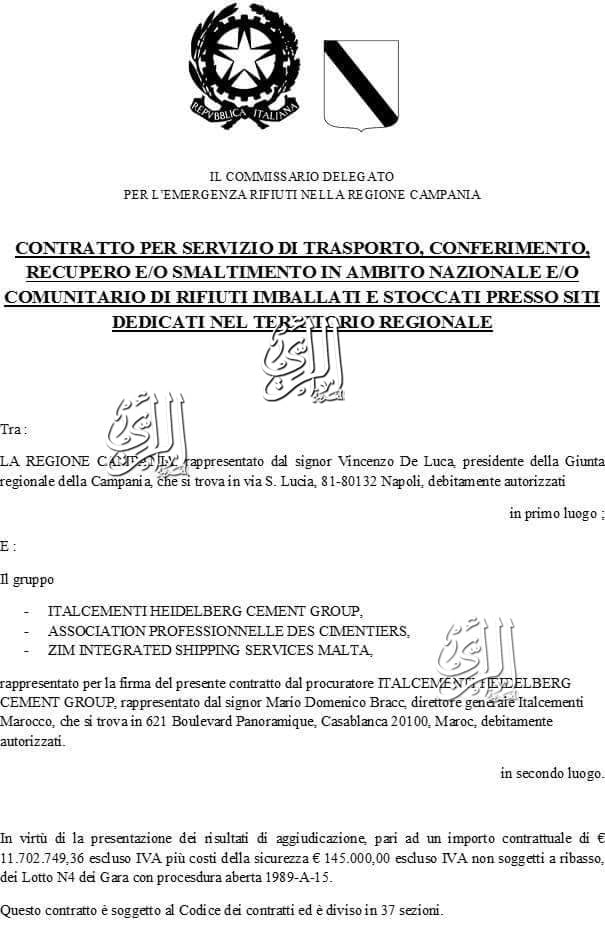 هذه التصريحات تكذبها نسخة من عقد عمومي عرضته جهة "Campania" التي قامت بتصدير النفايات الإيطالية إلى المغرب، يخص طلب عروض يجمع الجمعية المهنية للإسمنت ومجموعة شركات "إطالسمنت"،  تدفع بموجبه الجهة الايطالية للمتعاقدين حوالي 120 مليون درهم مقابل استقبال هذه النفايات .