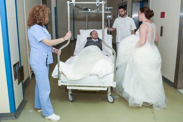 اضطر عروسان بريطانيان إلى إقامة حفل زفافهما في المستشفى، بعد تعرض العريس لحادث سيارة أصيبت ساقه على إثره إصابة بليغة.