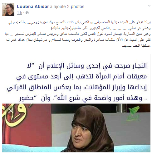 وقالت أبيضار في تدوينة على صفحتها بالفايسبوك : “بركا عيقتو على السيدة حياتها الشخصية….وداكشي باش كانت كتنصح دوك اميرة زوجي….ملكة بحجابي وعفتي في نقابي……………داكشي لكيديرو اكتر منتخيلو(حياتهم هاديك)”.