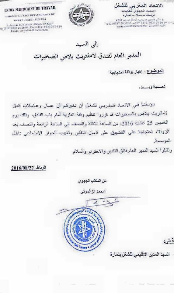 بعد رفعهم للشارات الحمراء في مناسبات عدة ، كإشارة منهم و تنبيها للاوضاع الصعبة و المزرية التي يعيش على وقعها فندق " لامفتريت " الصخيرات ، التابعة لممتلكات الشيخ العمودي ، و الذي يسير نحو حسب مصادر نقابية نحو المجهول ، نتيجة تردي التسيير الاداري ، في غياب تام لقنوات الحوار و التواصل مع المكتب النقابي ، الذي حاول مرارا حسب أعضاءه بحث حلول ناجعة لانقاذ هذه الوحدة السياحية من الكارثة ، و معها انقاذ أزيد من 300 أسرة مهددة بالتشرد ، في مقابل التضييق الممنهج على العمل النقابي و ممارسيه ، قرر المكتب النقابي الممثل الرسمي لعمال و عاملات فندق لامفتريت الصخيرات ، المنضوي تحت لواء الاتحاد المغربي للشغل ، خوض وقفة انذارية احتجاجية امام باب الفندق ، عشية هذا اليوم ، الخميس ، بداية من الساعة 3:30 إلى غاية 4:30 ، احتجاجا على التضييق المستمر على العمل النقابي ، و تغييب الحوار الاجتماعي داخل هذه المؤسسة .