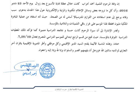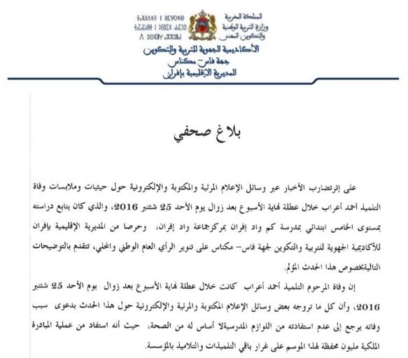 نفت المديرية الإقليمية لوزارة التربية الوطنية والتكوين المهني في إفران ، أن تكون وفاة التلميذ أحمد أعراب الذي كان يتابع دراسته بمدرسة كم واد افران بمركز جماعة افران، بسبب عدم استفادته من اللوزام المدرسية .