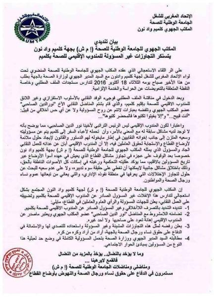 أدان المكتب الجهوي للجامعة الوطنية للصحة بجهة كلميم وادنون ما اسماه التصرفات والسلوكات اللامسؤولة للمندوب الإقليمي للصحة بكلميم، وذلك خلال اللقاء الذي عقده المكتب النقابي مع المدير الجهوي للصحة وحضره المندوب الإقليمي.