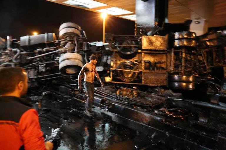 وقال شهود عيان إن سائق شاحنة خاصة بنقل الفيول (المحروقات) لم يستطع التحكم فيها فانزلقت، مخلفة قتيلا وجرحى وخسائر جسيمة بعدد من السيارات ومحطة الأداء ومرافق مُجاورة لعين المكان،