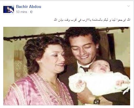 البشير عبدو نشر صورة له رفقة زوجته الفنانة نزهة الركراكي وابنه سعد ، و أرفقها بدعاء كتب فيه " الله يرجعوا لينا وليكم بالسلامة يااااارب في أقرب وقت بإذن الله " .