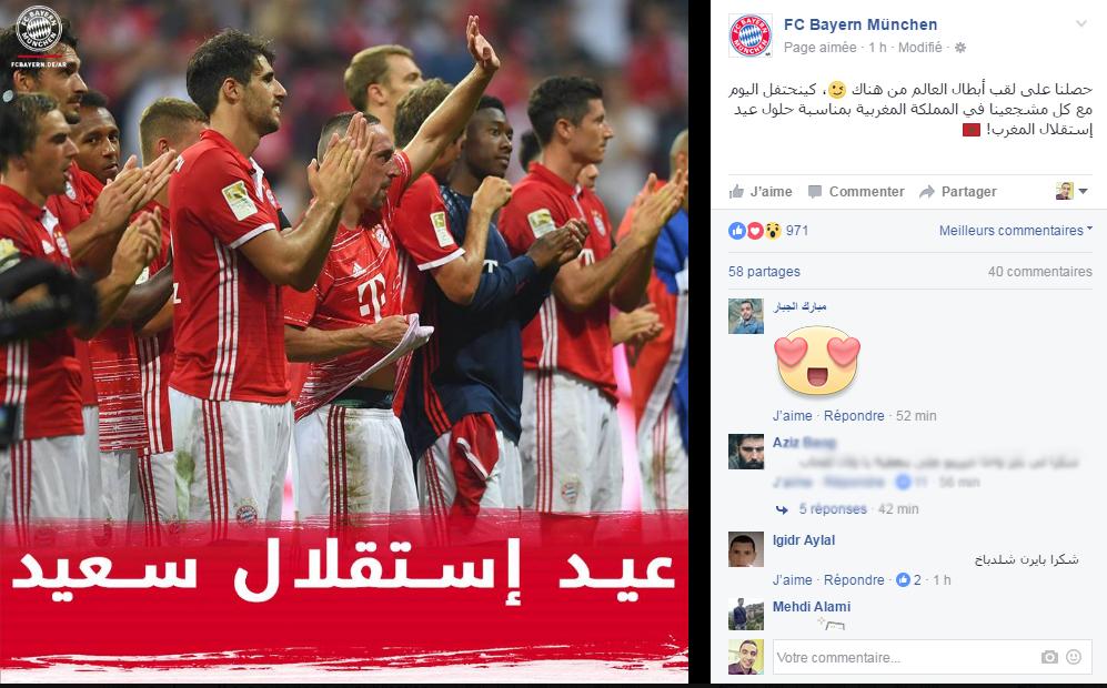 وقال النادي البافاري على صفحته الرسمية بموقع الفايسبوك: "كينحتفل اليوم مع كل مشجعينا في المملكة المغربية بمناسبة حلول عيد إستقلال المغرب! حصلنا على لقب أبطال العالم من هناك" .