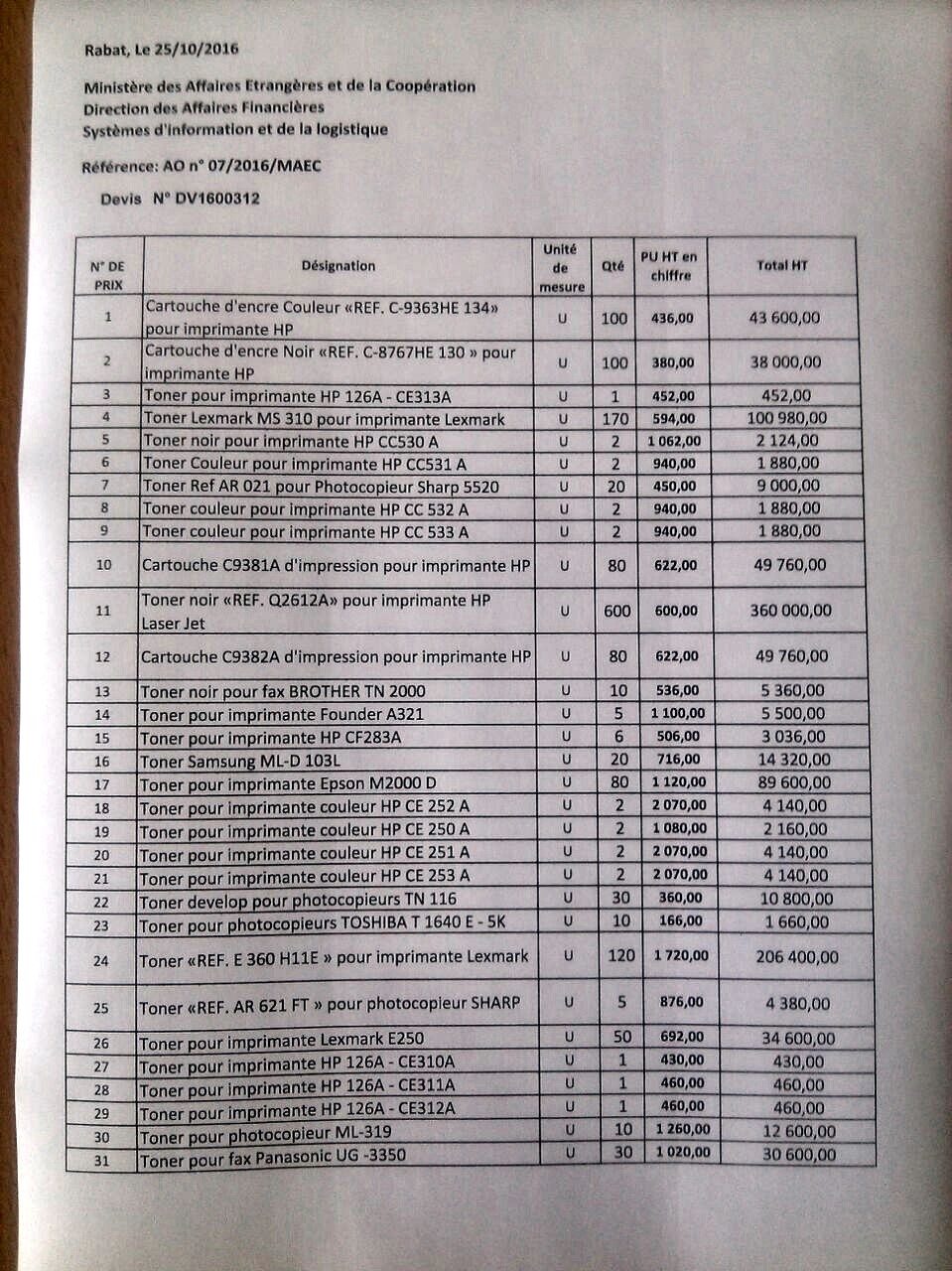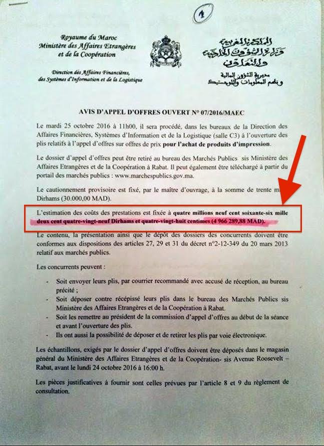 في سياق الحديث عن الحكامة اللازمة في تدبير المال العام ، و ربطها بالمحاسبة ، لازال نزيف إهدار " فلوس الشعب " مستمرا حتى إشعار آخر ، حيث توصلنا في موقع " أخبارنا المغربية " بمجموعة من الشكايات ، من شركات مغربية ، احتجت بشدة على ما وصفته بـ " التلاعب في صفقة عمومية " لشراء لوازم الطباعة ، و التي حدد لها صاحب المشروع ( وزارة الخارجية )، كلفة تقديرية بقيمة ( 4,966,289,88 درهم )  ، حيث تقدمت 7 شركات للمنافسة على هذه الصفقة ، لكن و قبل 10 أيام فقط من التاريخ المحدد لفتح الأظرفة ، قام صاحب المشروع بوضع تعديلات فيما يخص الأجهزة المطلوبة ، حيث وضع قائمة بأسماء عينات لا توجد في المغرب ، و التي تتطلب السفر إلى الخارج من أجل اقتنائها ، في عملية وصفها أحد المحتجين بالتعجيزية ، لكن و مع ذلك تمكنت الشركات المحتجة من جلب هذه العينات وفق المعايير المتفق عليها و التوقيت المحدد.