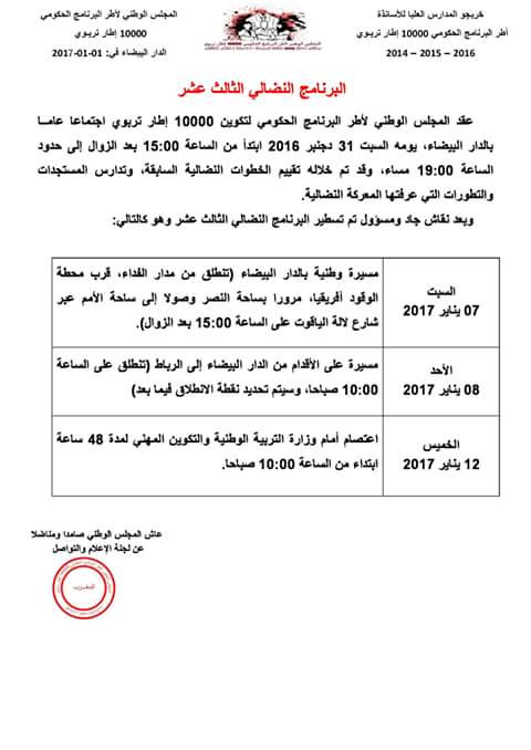 فطوال ثمانية أشهر من النضال يستمر الأطر التربوية في التصعيد في احتجاجهم ، فبعد قمع مسيرة الأقدام من مراكش الى الدار البيضاء سطر الأطر التربوية برنامجهم النضالي الثالث عشر, في كل من الرباط و الدار البيضاء ، و يبدأ البرنامج النضالي يوم السبت 7يناير بمسيرة وطنية بالدار البيضاء تنطلق من مدار الفداء في اتجاه ساحة الأمم ، و الأحد 8يناير مسيرة على الأقدام من الدار البيضاء في اتجاه الرباط ، ليختم الاطر التربوية برنامجهم النضالي بإعتصام أمام وزارة التربية الوطنية بالرباط.