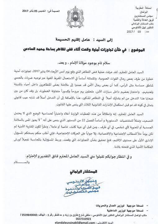 بالوثيقة : برلماني عن " البيجيدي " يتهم القوات العمومية بتعنيف المتظاهرين بالحسيمة