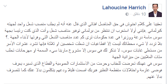 وأضاف في تدوينة على حسابه بفيسبوك: "سوس في عهدك تعرضت للعقاب وحرمت من الاستثمارات العمومية والقطاع  الذي تسيره يعرف فوضي عارمة واختلالات منقطعة النظير فبربك أصمت قليلا ودعهم يتكلمون بدلا عنك كما تتصرف بدلا عنهم".