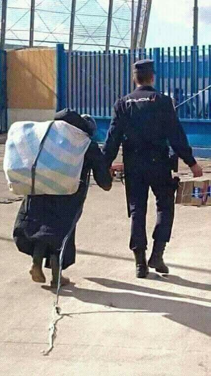 تداول رواد مواقع التواصل الاجتماعي صورة لشرطي اسباني عامل بالمعبر الحدودي باب مليلية وهو يساعد امرأة مغربية عجوز تمتهن التهريب المعيشي و يأخذ بيدها ويحمل عنها قليل من متاعها .