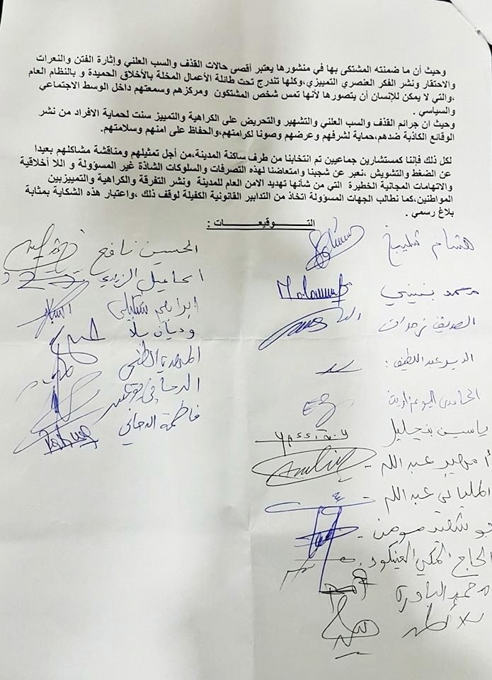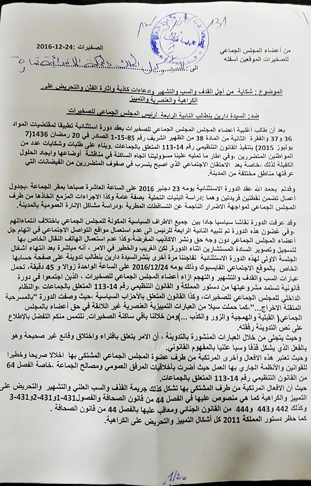 توصلنا في موقع " أخبارنا المغربية " بنسخة من شكاية وجهها 19 مستشار ومستشارة عن المجلس الجماعي بالصخيرات ، إلى السيد وكيل الملك بالمحكمة الابتدائية بتمارة ، طالب من خلالها المشتكون باتخاذ كل الإجراءات القانونية في حق النائب الرابعة لرئيس المجلس ، دارين بنطالب عن حزب العدالة والتنمية ، على إثر مهاجمتها لهم و لساكنة الصخيرات عموما ، عبر تدوينة من خلال حسابها الخاص على الفيسبوك ، تحمل عبارات السب و القذف و التشهير و التهجم في حق أعضاء المجلس البلدي ، بوصفها لهم بـ " الهمج " و " والقبلية " و دورة المجلس بـ " المسرحية ".. وذلك في أعقاب الدورة الاستثنائية المنعقدة بتاريخ 23/12/2016 ، والتي خصصت لمناقشة وتدارس نقطتين فريدتين طارئتين ، تهمان البنية التحتية و الإنارة العمومية ، أثر ارتفاع وثيرة الاحتجاجات على كارثية أوضاع هذين القطاعين الحيويين .