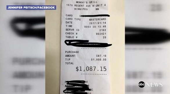 امرأة تترك إكرامية 1000 دولار لنادلة