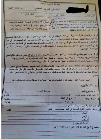 هذا وقارب نص الامتحان تحول مبنى هاجمته المقاتلات السورية والمتفجرات الروسية في غارة عسكرية إلى ركام فأفجع الجميع بملامح الضحايا المحروقة أجسادهم وسط القتلى المتناثرة أشلاؤهم.