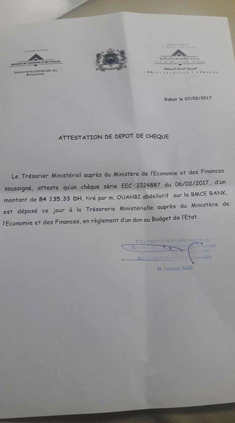 بالوثيقة ...البامي عبد اللطيف وهبي أول من أعاد تعويضاته المالية لخزينة الدولة