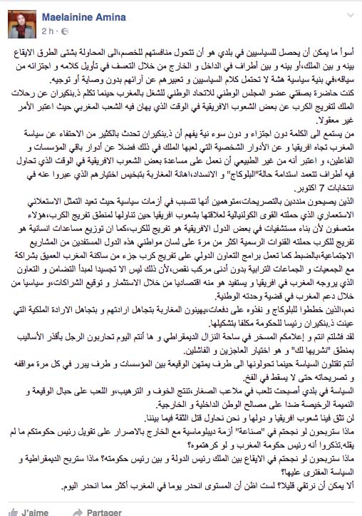 وتابعت ذات المتحدثة، في تدوينة لها على حسابها بـ "فايسبوك"، كنت حاضرة بصفتي عضو المجلس الوطني للاتحاد الوطني للشغل بالمغرب حينما تكلم الأستاذ بنكيران "عن رحلات الملك لتفريج الكرب عن بعض الشعوب الإفريقية في الوقت الذي يهان فيه الشعب المغربي حيث اعتبر الأمر غير معقولا"، متسائلة ماذا ستربحون لو نجحتم في الإيقاع بين الملك رئيس الدولة وبين رئيس حكومته؟ ماذا ستربح الديمقراطية والسياسة المفترى عليها؟ ماذا ستربحون لو نجحتم في "صناعة" أزمة ديبلوماسية مع الخارج بالإصرار على تقويل رئيس حكومتكم ما لم يقله.