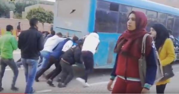 تداول رواد مواقع التواصل الاجتماعي فيديو يظهر فيه طلبة يدفعون حافلة للنقل الحضري قرب كلية الاداب ببني ملال ويساعدونها على تشغيل المحرك ، حيث يسمع في الفيديو أصوات سخرية وضحك من طرف المواطنين .