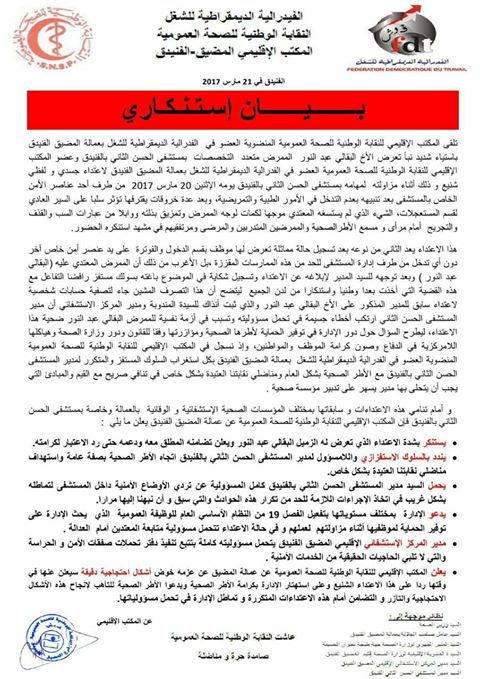و عبر المكتب الاقليمي للنقابة الوطنية للصحة العمومية العضو في الفدرالية الديمقراطية للشغل بعمالة المضيق الفنيدق في بيان تتوفر "أخبارنا" على نسخة منه،  عن استنكاره الشديد  لهذا الاعتداء الشنيع وتنديديه بالتماطل الغير المفهوم والسلوك المستفز الذي نهجه مدير المستشفى مع الممرض موضوع الاعتداء حيث جاء في نص البلاغ " وبعد توجهه للسيد المدير لإبلاغه عن الاعتداء وتسجيل شكاية في الموضوع باغته بسلوك مستفز رافضا التفاعل مع هذه القضية التي أخذت بعدا وطنيا واستنكارا من لدن الجميع  ليتضح أن هذا التصرف المشين جاء لتصفية حسابات شخصية لاعتداء سابق للمدير المذكور على الأخ البقالي عبد النور والذي ثبت أنذاك للسيدة المندوبة ومدير المركز الاستشفائي أن مدير المستشفى الحسن الثاني ارتكب أخطاء جسيمة في تحمل مسؤوليته وتسبب في أزمة نفسية للممرض البقالي عبد النور ضحية هذا الاعتداء،" متسائلا حسب نفس البيان  حول دور الإدارة في توفير  الحماية لأطرها الصحية ومؤازرتها وفقا للقانون ودور وزارة الصحة وهياكلها اللامركزية في مراقبة مسؤولييها وحثها على تطبيق القانون والضرب بيد من حديد على يد من تسول نفسه النيل من كرامة الأطر الصحية والمواطنين."