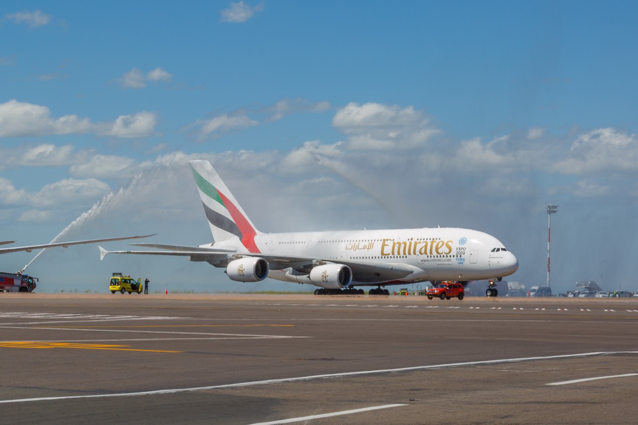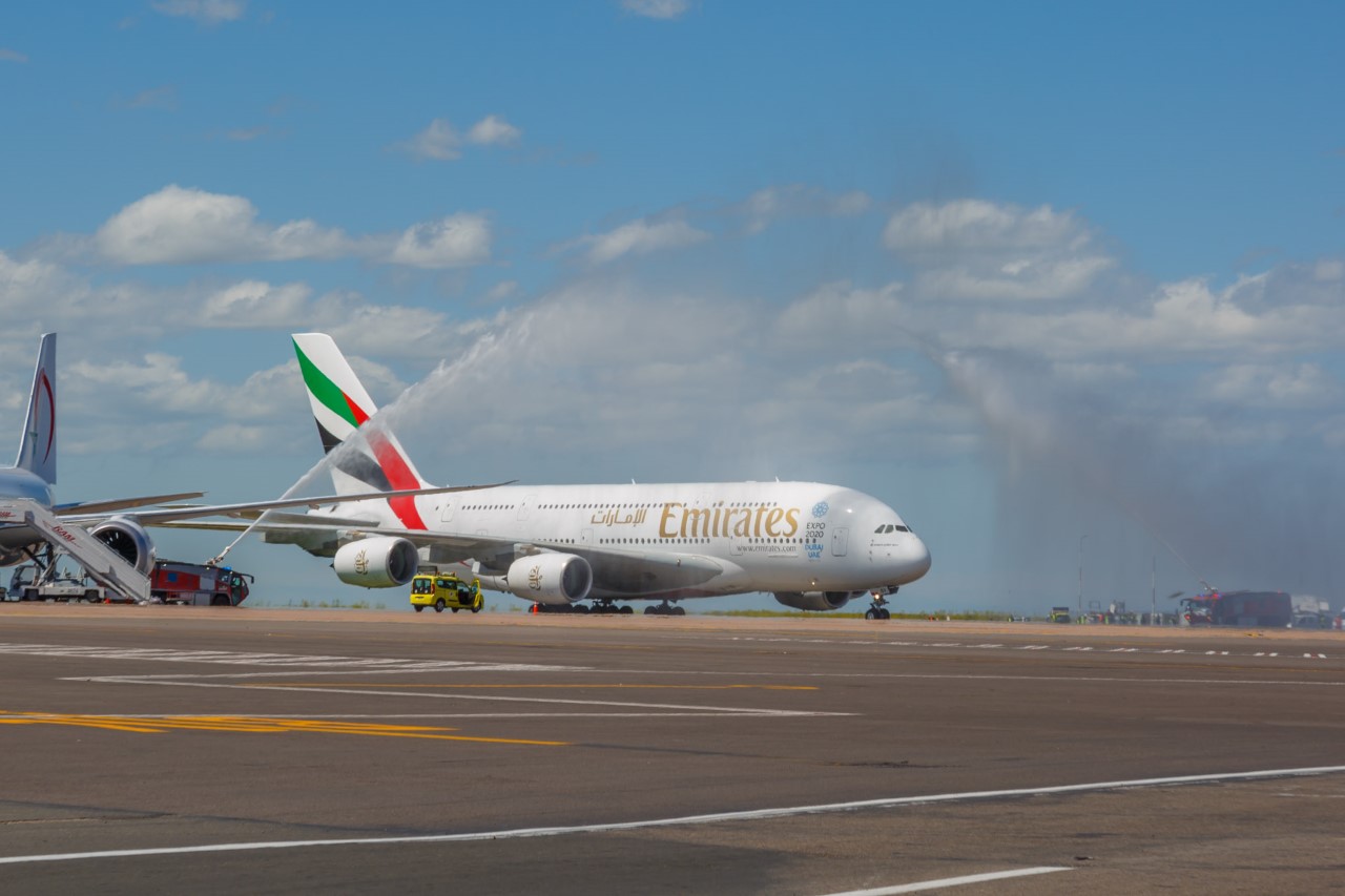 وقد تم الاحتفاء بوصول الرحلة الأولى لطائرة A380 بالرشاشات المائية التقليدية ، وكان في استقبالها مسؤولون كبار، ووصل على متنها وفد من مسؤولي طيران الإمارات على رأسه السيد أورهان عباس، نائب رئيس طيران الإمارات للعمليات التجارية لمنطقة أفريقيا، وعدد من ممثلي وسائل الإعلام العربية.