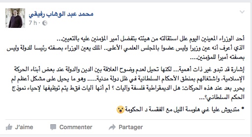 في تدوينة له عبر حسابه الخاص على الفيسبوك ، استغرب الاستقلالي محمد عبد الوهاب رفيقي ( أبو حفص ) كيف أن وزيرا - محمد يتيم - في حكومة العثماني ، لا يميز بين صفة الملك كرئيس دولة و صفة أمير المؤمنين.