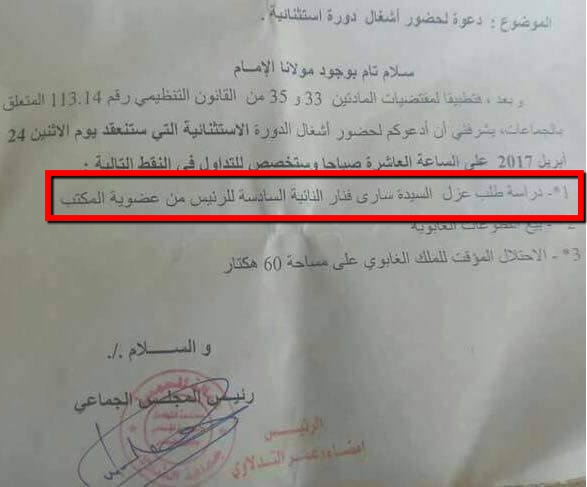 نفذ رئيس جماعة الشلالات تهديداته السابقة في حق نائبته السادسة سارى فنار عن حزب الاستقلال، بعدما أدرج نقطة مثيرة في جدول أعمال دورة مجلسه الاستثنائية المزمع عقدها يوم الاثنين 24 أبريل المقبل ،تتعلق بدراسة طلب عزل المستشارة المذكورة سالفا ، وهي النقطة التي وصفها بعض المستشارين بالتعسفية وغير القانونية .